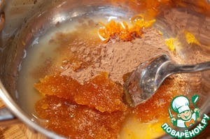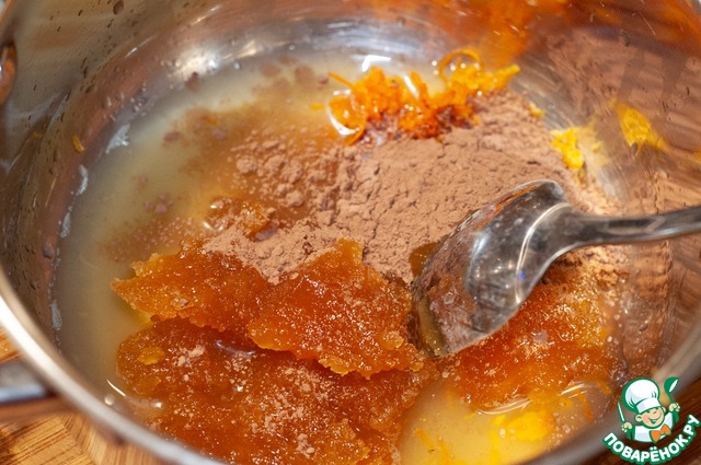В сотейнике соединить сок половины апельсина и лимона. Добавить цедру, мёд, сахар, какао, воду и поставить на огонь.