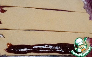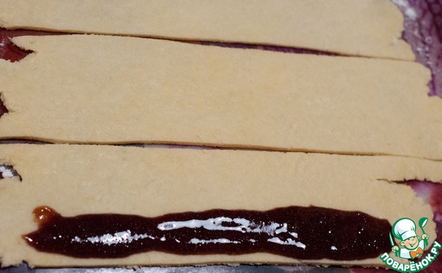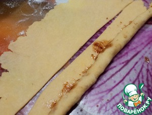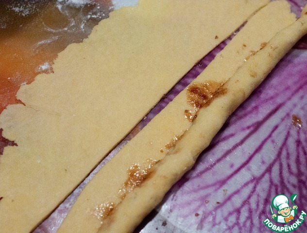 Тесто нужно тонко раскатать прямоугольником и разделить на 6 длинных полосок.