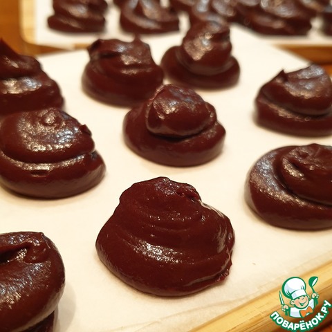 Переложить шоколадную массу в пакет с замком зип, отрезать уголок и отсададить на пергамент заготовки для конфет. Поставить в холодильник на 15-30 минут. Старайтесь сразу отсаживать ровненькие заготовки, в последствии с ними проще дальше работать.