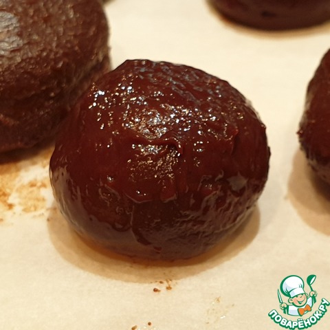 Тем временем расплавить на водяной бане оставшийся шоколад. Достать из холодильника заготовки и при помощи вилки обвалять заготовку со всех сторон в шоколаде, затем выложить на пару минут на пергамент, чтобы шоколад немного остыл.