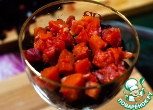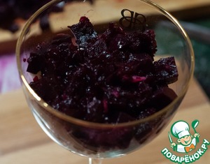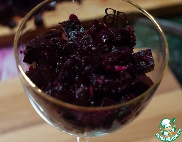 За считанные минуты. Нарезанную свёклу переложить в салатник и залить уксусом. Оставить на несколько часов мариноваться (можно с вечера замариновать и готовить росолли утром).