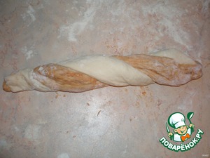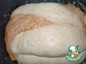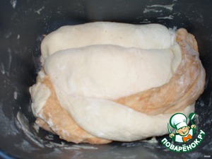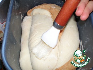 каждую половину разжелить на 3-4 части. По одной отложить, из остальных вылепить рулеты и уложить их на дно чаши ( предварительно удалив замешивалку.