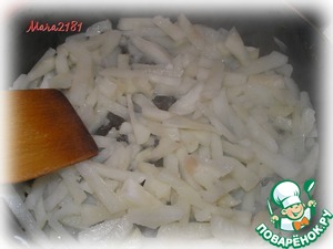 На небольшом огне, добавив 3 ст. л. растительного масла, обжарить топинамбур 6-7 минут, постоянно помешивая. Затем добавить мелко нарезанный лук и обжаривать всё вместе ещё около 5 минут до лёгкой румяности.