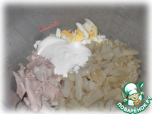 Топинамбуру с луком дать немного остыть. После чего в общей ёмкости соединяем подготовленные ингредиенты: кусочки куриного мяса, яйца и топинамбур с луком. Добавить примерно 3 ст. л. сметаны и перемешать.