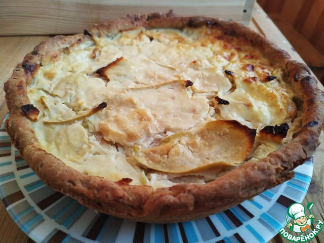 8. Выложить яблоки на тесто, распределить по форме и залить заливкой.