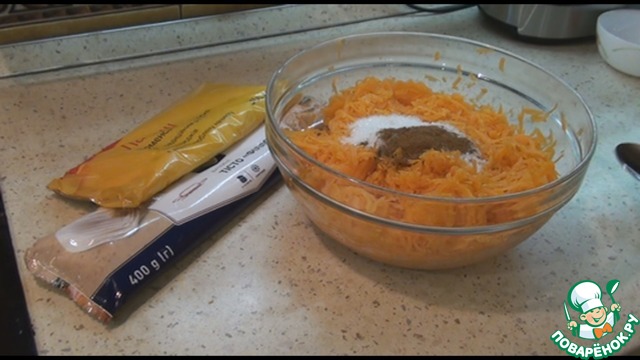 Тыкву помыть, почистить и натереть на крупной терке. Добавить 100 гр сахара и корицу, если хотите, можно еще добавить пряности по вкусу. Хорошо размешать и оставить, чтоб немного настоялась.