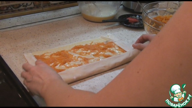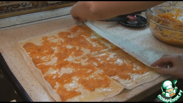 Накрываем вторым листом теста и опять смазываем, накрываем третьим листом и снова смажем заливкой. Сверху выкладываем натертую тыкву не толстым шаром по всей поверхности теста.