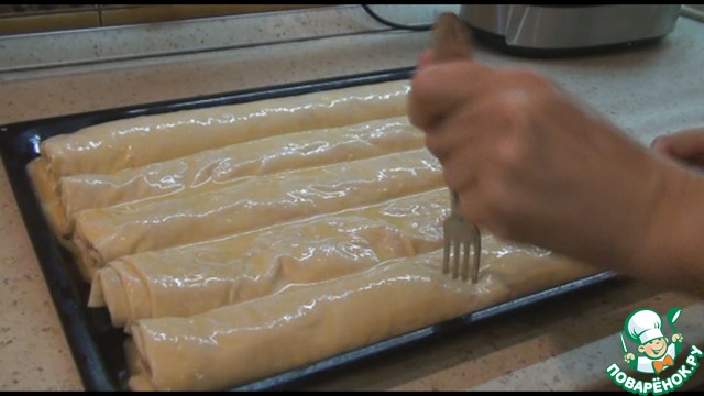 Потом аккуратно заворачиваем рулетом. Выкладываем на противень, смазанный подсолнечным маслом.