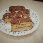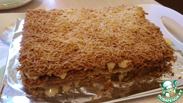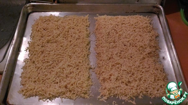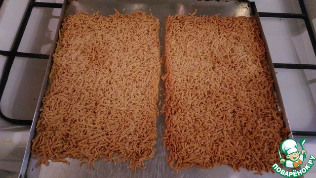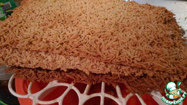 Затвердевшее тесто натираем на терке и распределяем по противню по форме коржей для торта. У меня получилось 4 коржа из этого количества теста размером 20х30 см.