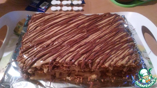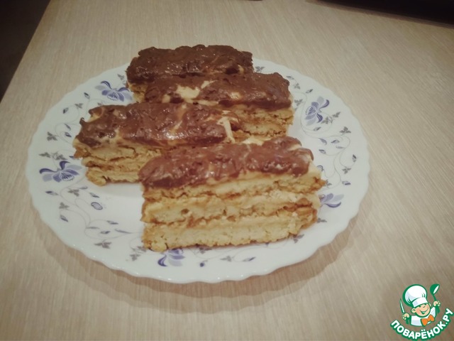 Остывшие коржи смазать кремом. Верхний корж можно и не смазывать, если вы любите более хрустящие коржи.