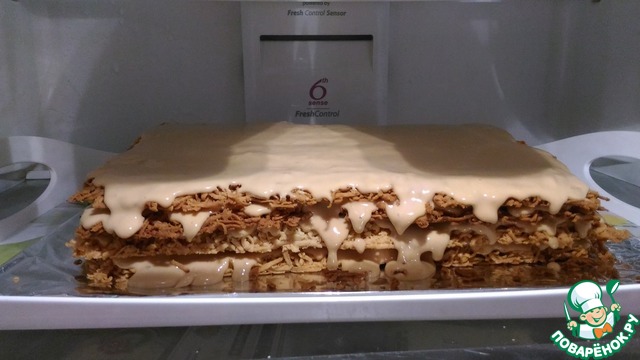 Я верх тоже смазала кремом. Далее ставим торт в холодильник минимум на 3 часа, чтобы крем пропитал коржи. Естественно, чем дольше торт настаивается, тем больше пропитывается.