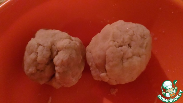 Размягчаем сливочное масло, добавляем сметану, сахар и перемешиваем. Добавляем муку, смешанную с разрыхлителем. Замешиваем тесто сначала вилкой, затем руками и формируем 4-6 одинаковых шарика.