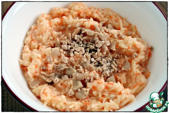Затем берём небольшое количество получившейся картофельной массы, добавляем дрожжи, хорошо перемешиваем и соединяем с основной массой, тщательно всё перемешиваем. Дрожжи делают нашу массу более однородной и пышной, что естественно сказывается на вкусе и внешнем виде...
