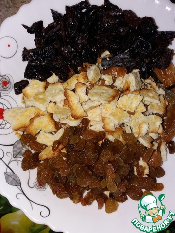 В глубокую ёмкость положим варёную сгущёнку, измельчённый чернослив, изюм и кусочки (примерно 1×1 см) печенья. Сухофрукты перед нарезкой хорошенько промыть в горячей воде.