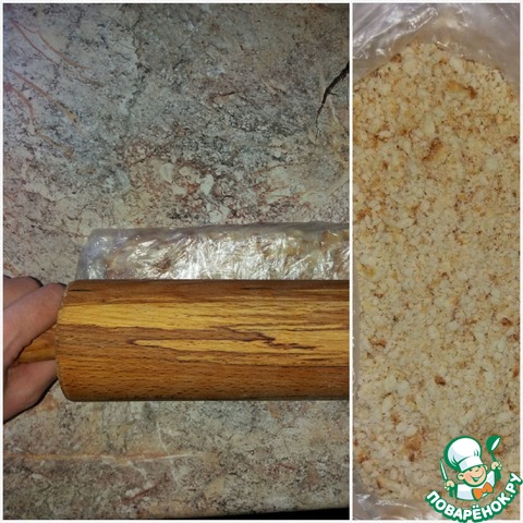 Если в качесте панировки используем печенье, измельчаем его в крошку: кладу в пакетик кусочки и раскатываю скалкой.