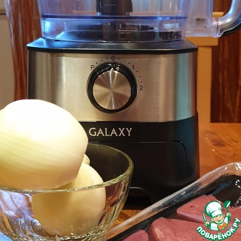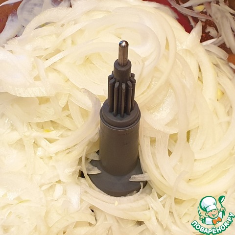 В комбайне нашинковать лук полукольцами. У меня данный процесс занял не более 10-12ти секунд.