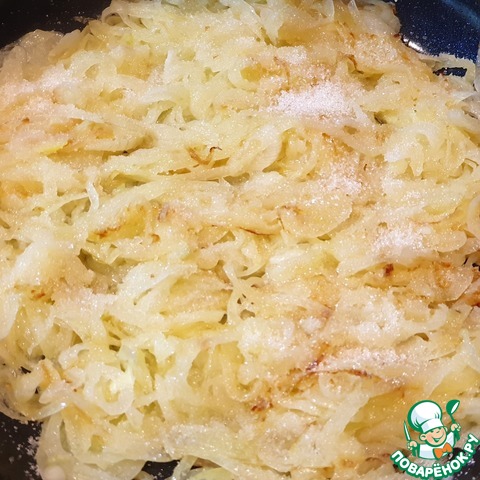 Нагреть сковороду, влить 2 ст. л. растительного масла и добавить 10г сливочного масла. Прогреть и выложить лук. На достаточно сильном огне, переворачивая, обжарить лук до золотистого цвета. Добавить сахар и соль и карамелизировать лук. Обжарить ещё пару минут. Выключить нагрев.