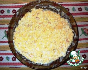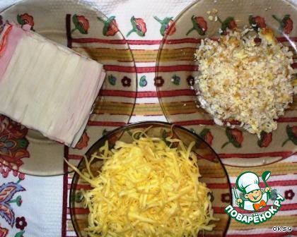 Готовим начинку:смешиваем натертые сыр и блин, добавляем чеснок и заправляем всё майонезом.