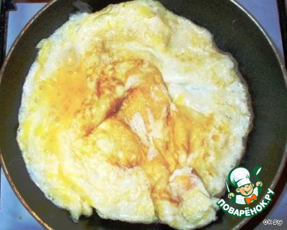 Готовим яичный блин для начинки, для этого взбиваем два яйца и обжариваем с двух сторон. И оставляем его, чтобы остыл.