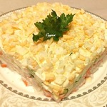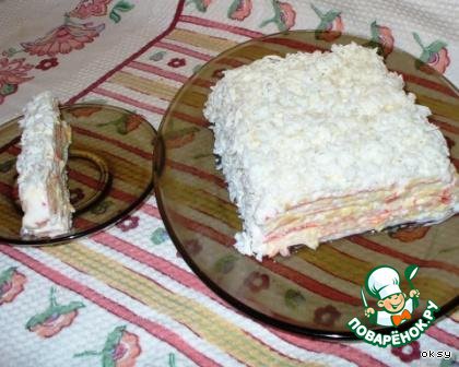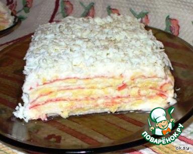 Теперь послойно выкладываем:на дно - крабовую палочку (в развернутом виде, единым пластом), затем начинку и так чередуя.