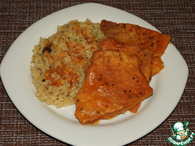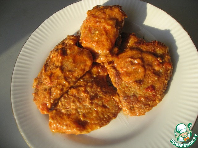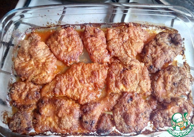 Половину соуса вылить в подготовленный противень или форму для запекания. Выложить обжаренные отбивные в один ряд, слегка оступая друг от друга. Залить оставшимся соусом.