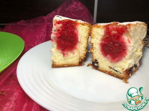 6. Готовый кекс остужаем и перекладываем на блюдо. В середине кекса делаем углубление ( я делала углубление при помощи шприца 10 гр.), аккуратно не доходя до дна кекса, убираем мякоть и в подготовленные углубления добавляем клюкву протёртую с сахаром. Сверху кекс можно присыпать сахарной пудрой и подавать к столу.