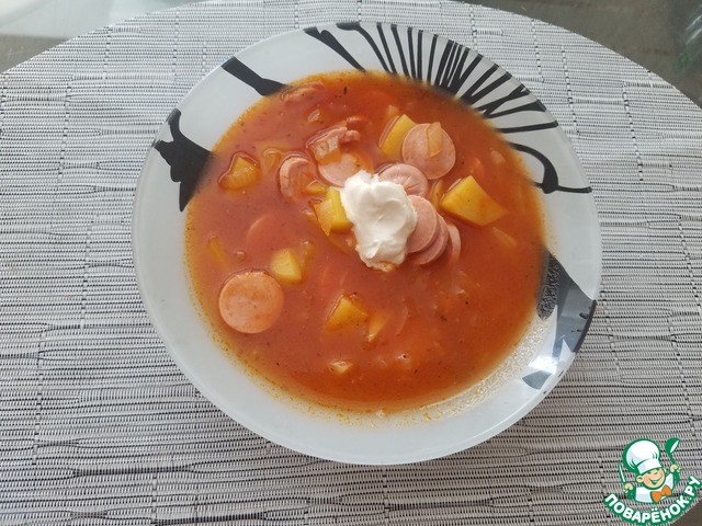 За 5 минут до конца варки добавить колбаски.