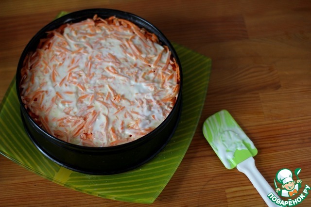 • Укладываем вторым слоем, смазываем майонезом и чуть солим.