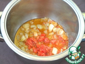 В кастрюле разогреть подсолнечное масло. Нарезать кубиками лук и помидор, очищенный от шкурки. Сначала обжарить немного лук, добавить к нему помидор.