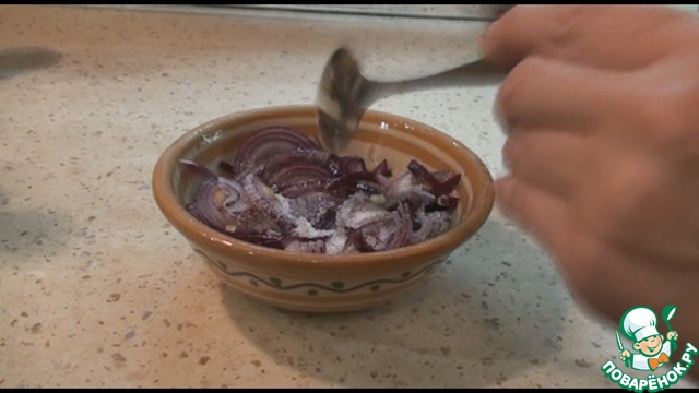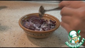 Замаринуем лук: можно взять красный, а можно и обычный. Нарезаем лук полукольцами, добавляем 1 ст. л. сахара, уксус и я добавила наршараб, если нет, можете не добавлять. Хорошо перемешаем, немного утрамбуем, накроем крышкой и оставим мариноваться.