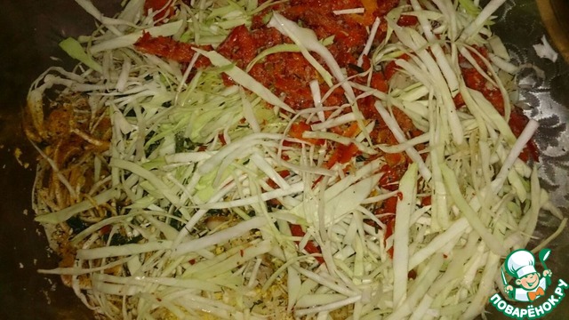 У нас, например, любимая такая - капусту мелко посечь, перец болгарский (свежий или замороженный) полосками, яйца сварить и натереть на свекольной тёрке, мясо готовое любое полосками (мясо жарим на гриле большим стейком, а потом остывшее нарезаем), сыр типа голландского - кубиками и зелень нарезать - укроп вот очень подходит и специи, кроме соли. Аккуратно всё перемешать - начинка готова. СОЛЬ не даём в начинку - потому, как начинку можно тогда несколько дней спокойно в холодильнике хранить. -