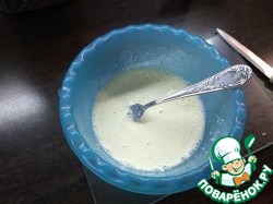• В миску разбить одно яйцо, взбить его. Очистить две-три дольки чеснока и выдавить в миску, положить две столовые ложки майонеза, добавить немного воды и тщательно все перемешать вилкой.
