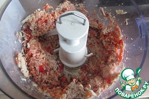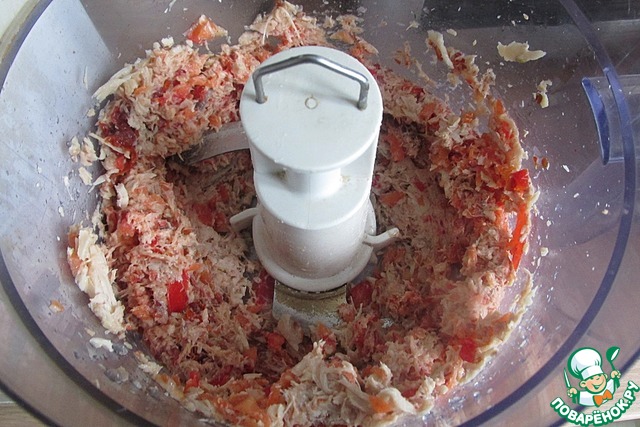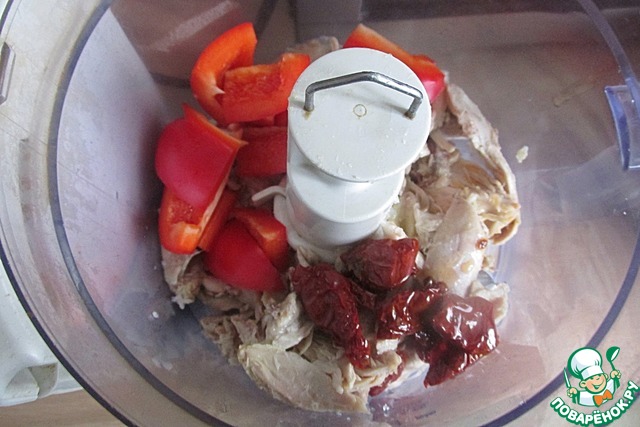 Мякоть вареной курицы, кусочки сладкого перца и вяленые томаты укладываем в чашу блендера