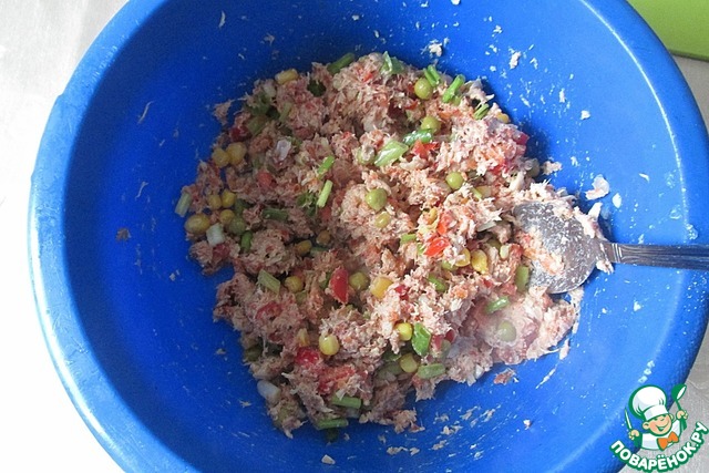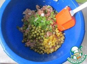 Перекладываем фарш в миску, добавляем кукурузу, горошек и зеленый лук