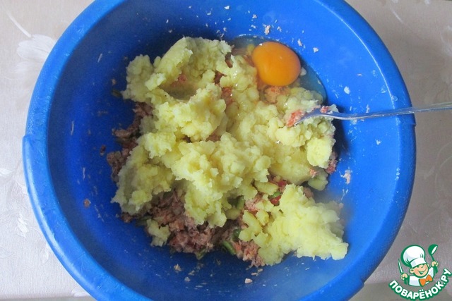 Хорошо перемешиваем. Формируем руками 6-7 пирожков, обваливая их на доске в панировочных сухарях