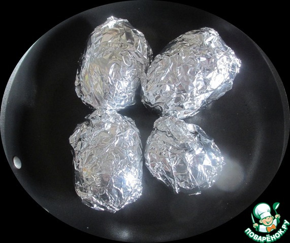 Картофель промываем, посыпаем слегка солью и заворачиваем каждую картофелину в фольгу. Запекаем картофель в духовке 1 час при 200 град. С,