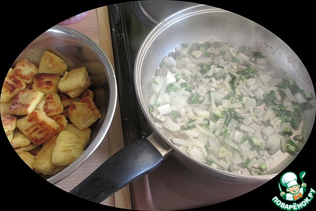 Перекладываем обжаренные клецки в отдельную миску, вливаем на сковороду ещё растительного масла, высыпаем лук и чеснок и обжариваем 2-3 минуты.