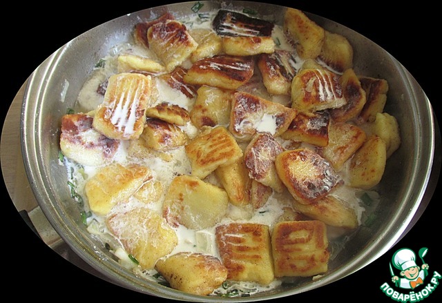 Добавляем вино. Как только вино закипело, пересыпаем клецки в сковороду, вливаем сливки. Перемешивая обжариваем до кремовой консистенции. Добавляем по вкусу соль. Держим на огне ещё минуту и снимаем с огня.