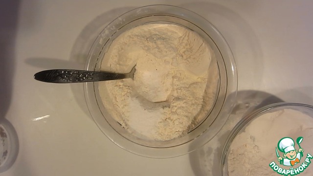 В половину муки добавляем разрыхлитель и ванилин, перемешиваем.