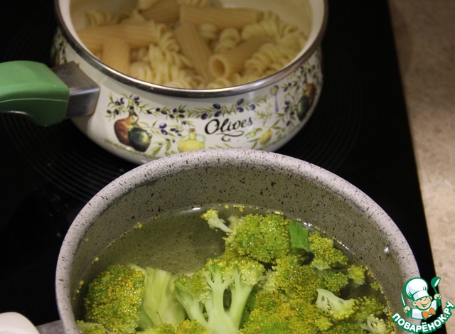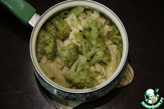 В другой кастрюльке параллельно отварить капусту брокколи с подсоленной воде, разделенную на соцветья. И смешать содержимое обеих кастрюлек, можно чуть постоять дать. -
