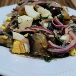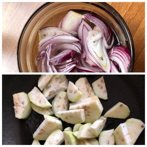 Лук нарезать полу кольцами и замариновать минут на 20 в холодной воде (100 мл) с яблочным уксусом и сахаром. Тем временем, баклажаны очистить и нарезать полу дольками. Обжарить в растительном масле до готовности. Выложить на бумажные полотенца баклажаны, чтобы стекло лишнее масло.