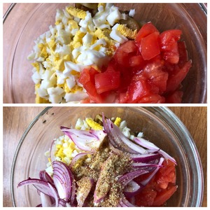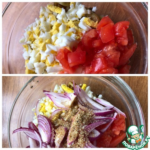 В салатник выложить помидор нарезанный кубиком, как и яйца. Лук отжать и добавить к салату вместе с остывшими баклажанами. Добавить соль, молотый перец и если надо оливково масла. Салат перемешать.