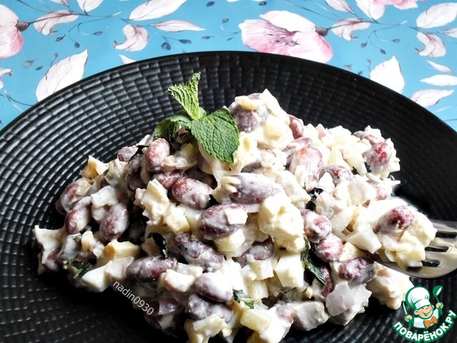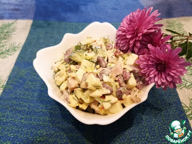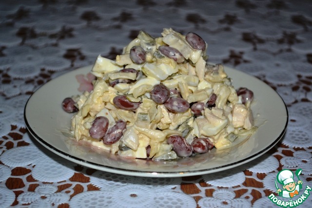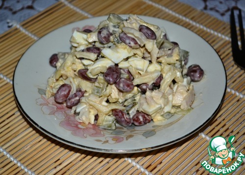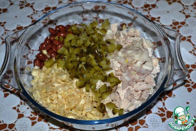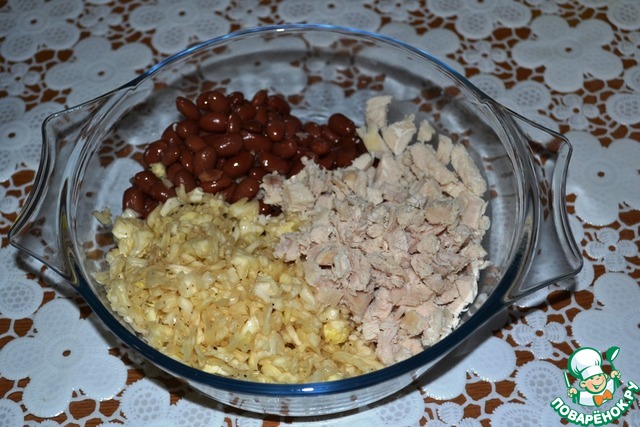 В глубокую посуду выложить капусту, красную консервированную фасоль и куриное отварное мясо, нарезанное кубиками.