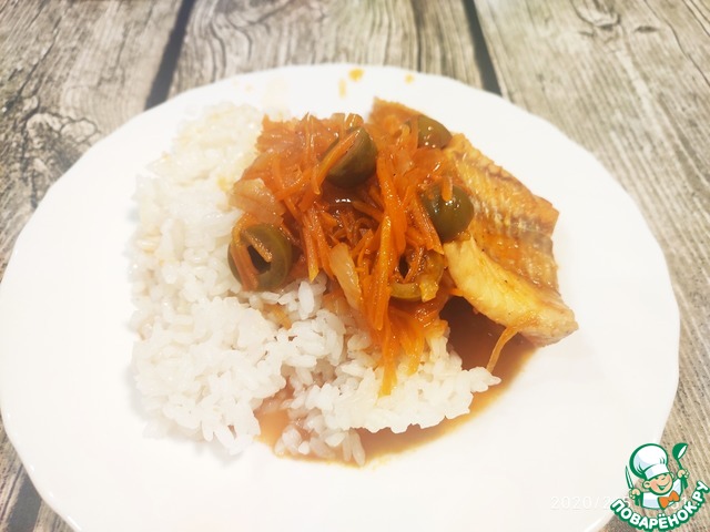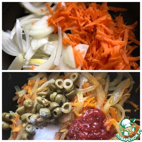 Лук нарезать полу кольцами, морковь натереть на крупной тёрке. Обжарить овощи в растительном масле до стадии аль-денте. Добавить специи, сахар, уксус и кетчуп. Оливки нарезать кружочками и добавить к овощам. Влить стакан кипячёной воды, все перемешать и убавить огонь до средне-слабого.