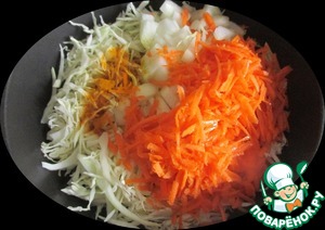 Капусту шинкуем тонкой соломкой, лук нарезаем полукольцами, морковку натираем на терке.