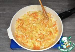 На небольшом количестве масла пережарить в течение 5 минут лук и морковь. Затем добавить капусту, посолить и готовить до полуготовности