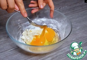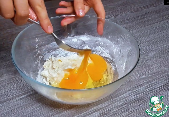 Добавить яйца и разрыхлитель, взбить. Затем добавлять оставшуюся муку по 2-3 ложки и следить за густотой теста.
