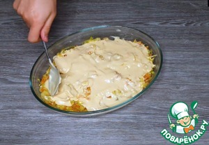 Форму смазать маслом и вылить половину теста, сверху положить начинку и залить оставшимся тестом.