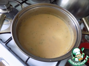 Ставим опять на огонь, доводим до кипения, наливаем сливки или молоко. Перемешиваем, досаливаем, доводим до кипения и снимаем с огня. Даём постоять немного.