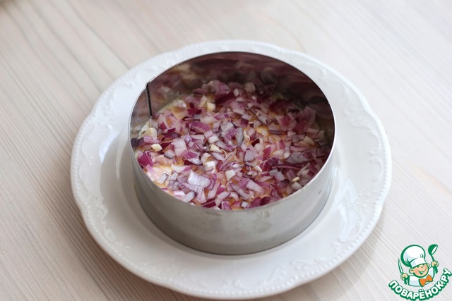 Салат собирается в кольце. На дно формы выложить картофель, заправленный майонезом, слой разровнять. Далее красный лук нарезать мелкими кубиками. Выложить на картофель кубики лука.